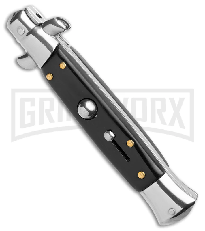 This 9″ Italian-Style stiletto features black Pearlex scales and a kriss style blade.