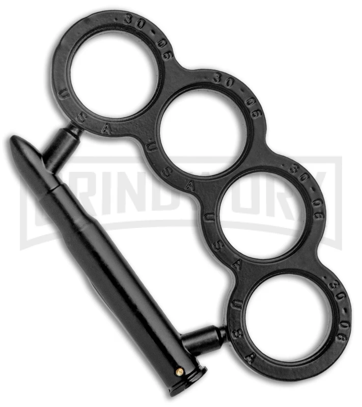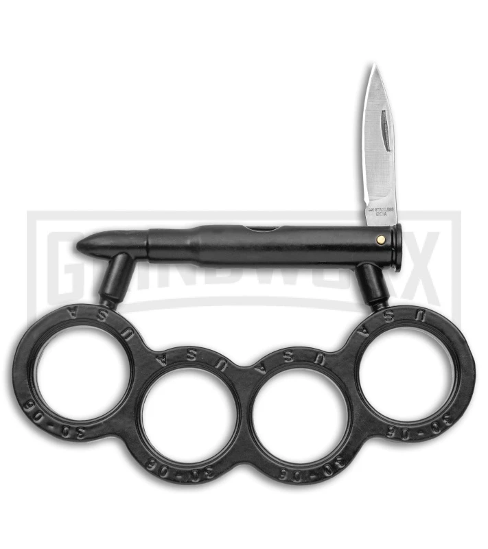 The steel knuckle has an attractive black finish and makes a great fashion accessory, paper weight, or desk item for the office or home. The handle is designed to replicate the look of a bullet and contains a small spear point blade with a nail nick opener. Show it off to your friends by adding it to your niche collection. You’ll enjoy the weight, feel, and look of this 4-finger knuckle.