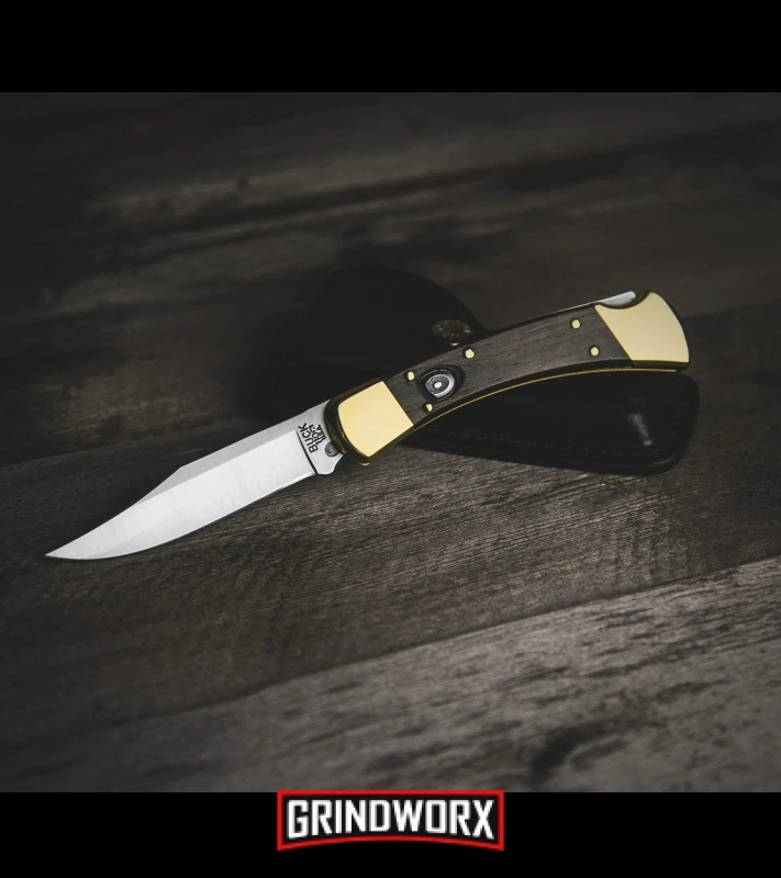 This Buck 110 knife features push button automatic action and the strength of a traditional lockback mechanism. This folder has a satin finished 420HC steel blade and a genuine ebony handle with brass bolsters. Includes a genuine leather sheath designed to prevent deployment when removing the knife.