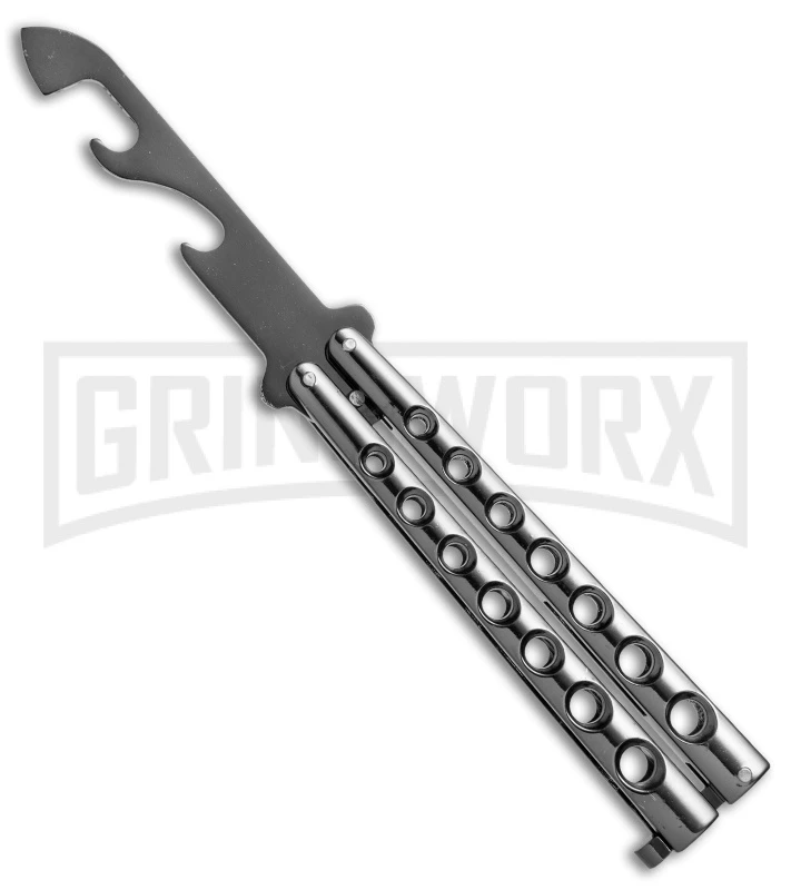 Keep your flipping skills finely honed with this Butterfly trainer from Caliber Gourmet. It features a can opener and a bottle opener on the blade, so you can safely practice butterfly tricks without cutting up your hands. The handles are made from skeletonized stainless steel with a steel latch for securing the blade in the open or closed position. This model has a gunmetal gray handle and a satin finished blade.