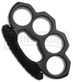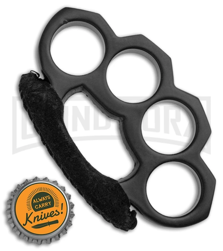 One part fashion, one part business, this steel and black leather knuckle is a novelty item that packs a serious punch. It makes a great paperwieght or wall decoration. Each hole is 1″ in diameter and should fit up to ring size 13. These are illegal in some locations so be sure to check your local laws before making an order.