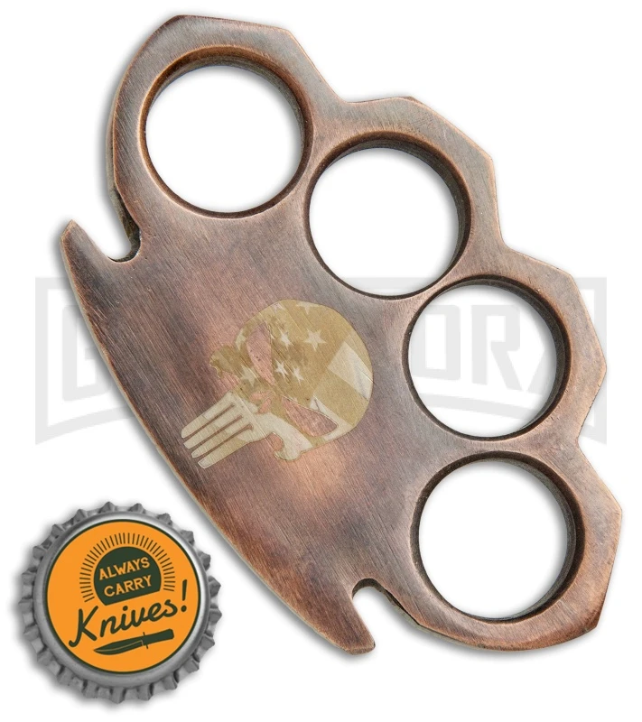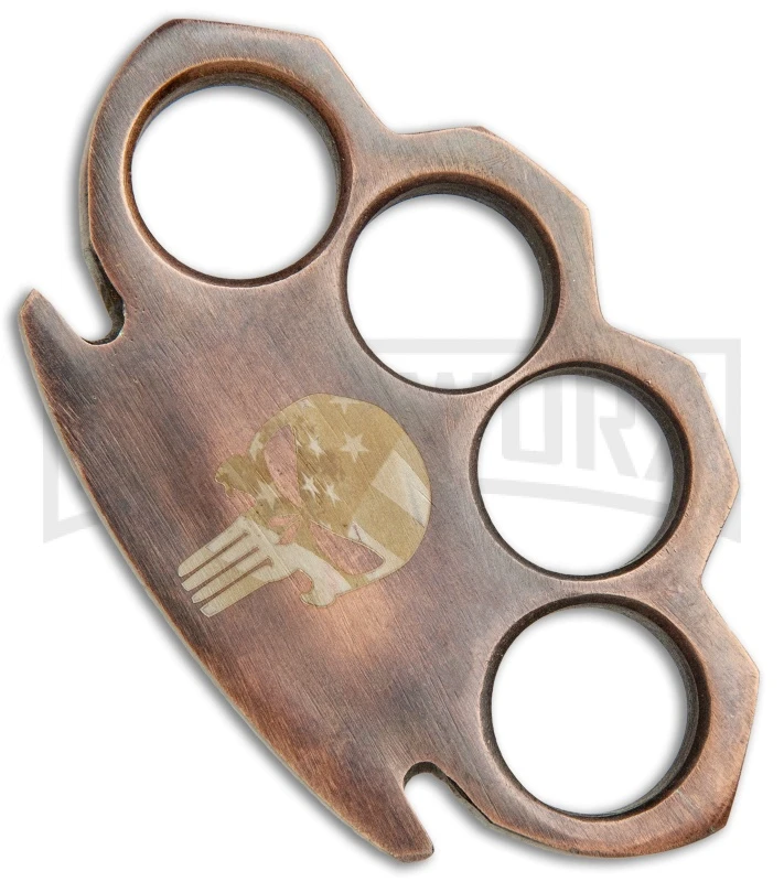 This awesome knuckle weight is sold for novelty or collection purposes only. It is made from stainless steel in a copper finish with a cool skull graphic. They make a great paper weight or office decoration item. Be sure to check your local laws before purchasing as these are not legal in some areas. Add these classic looking knuckles to your collection today!