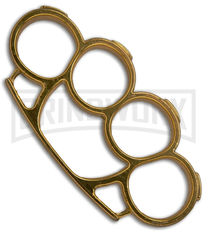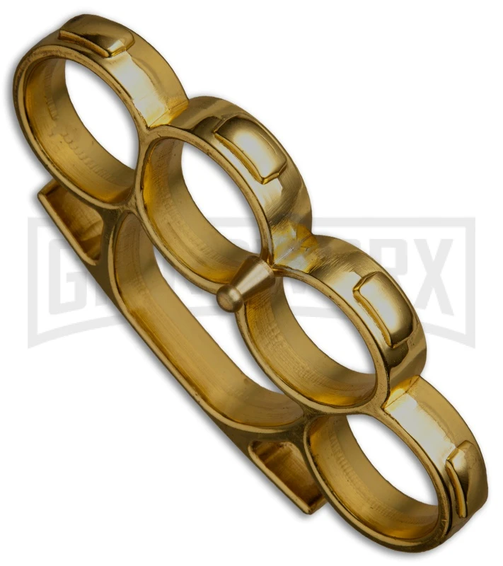 The Iron Fist Knuckleduster makes a great paperweight around the house or in the office. Screw in the included belt buckle pin, and these knuckles can also be used as a convenient belt buckle. This model is made from aluminum with a gold colored finish. Sold for novelty purposes only.
