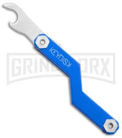 This KeyDisk Mini has a satin gun blue finish in aluminum, a bottle opener, and an eight-key capacity.