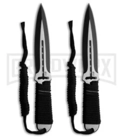 This M-Tech Extreme Throwing Daggers comes in a set of two with a custom carrying black nylon sheath. Each knife features a double edge dagger made of 440 stainless steel, two-tone finish (black finish on the grinds and satin finish on the flats), and black paracord full tang handle.