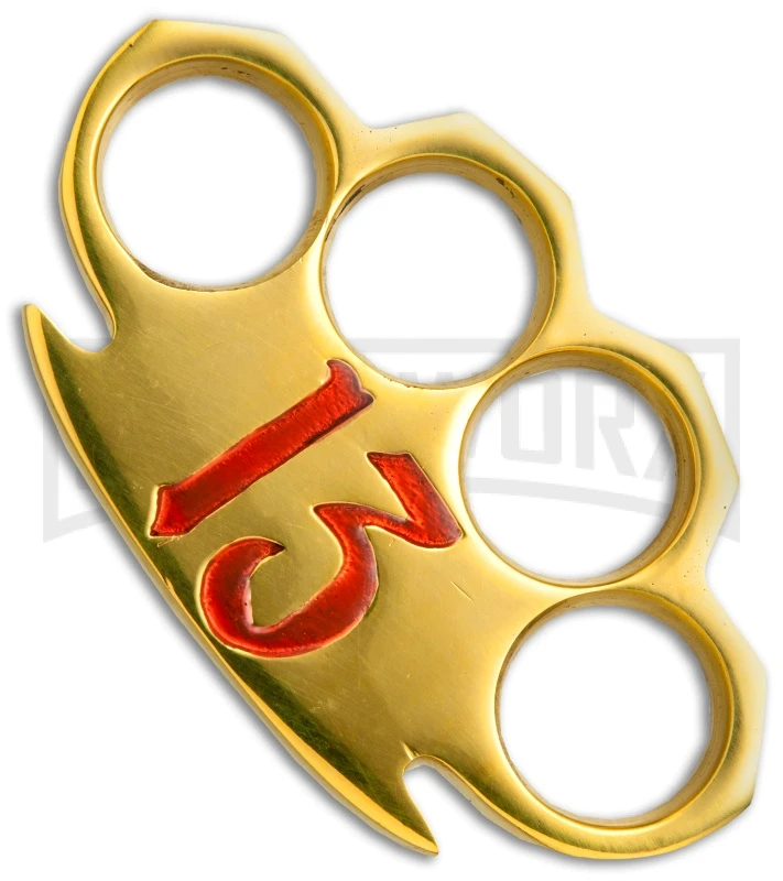 The Lucky Thirteen Paper Weight knuckles offer a classic design for collection or novelty use. They are made from solid brass with an impressive polished finish. 1 inch finger holes accommodate most hand sizes with a four finger design. This model features a red engraved “Lucky Thirteen” graphic.