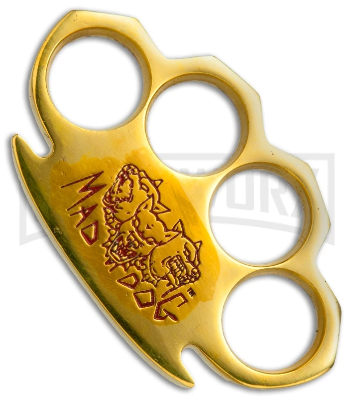The Mad Dog Paper Weight knuckles offer a classic design for collection or novelty use. They are made from solid brass with an impressive polished finish. 1 inch finger holes accommodate most hand sizes with a four finger design. This model features a red engraved “Mad Dog” graphic.
