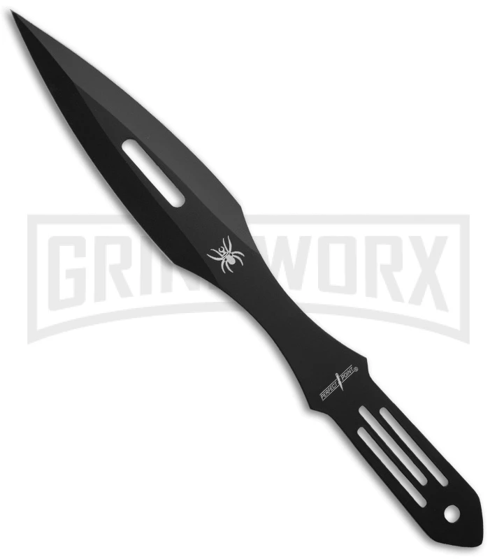 This Perfect Point Throwing Set comes with three sharp dual edge daggers. Each 9″ dagger features stainless steel construction, a black-finish, spider icon stamped on the tang, and full tang handle. Includes a custom black nylon sheath.