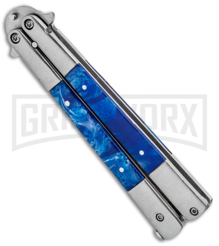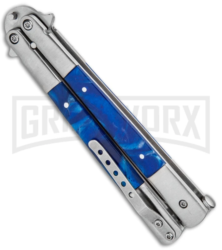 The Regal Blue Swirl butterfly knife has solid, smooth action. It features bolstered steel frame handles with blue swirl acrylic insert and a pocket clip. The 440 stainless steel partially serrated clip point blade has two tang pins, which results in tighter lock-up and less blade wear. The knife is constructed with Torx screws for easy adjustment of the knife.