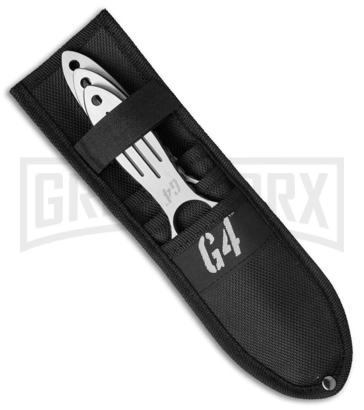 The G4 Stryker Set from Renegade Tactical features three high quality throwing knives and a convenient carry sheath. Each blade measures 8″ in length and comes in a two-tone finish with satin flats and black grinds. A large finger hole in the handle improves grip and blade accuracy. Includes a nylon belt sheath for convenient EDC.