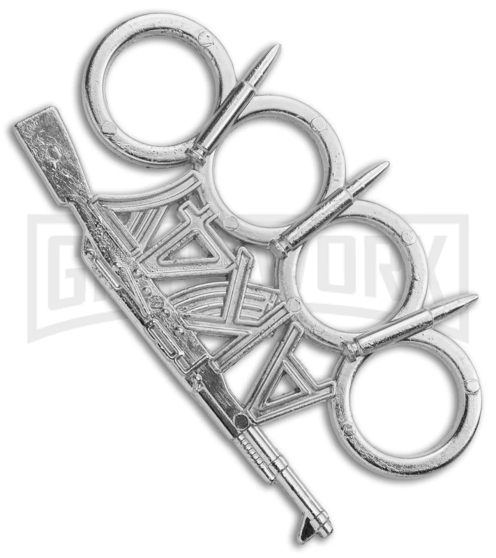 The AK47 steel knuckle with a unique silver finish makes a great fashion accessory, paper weight, or desk item for the office. Show it off to your friends by adding it to your niche collection. You’ll enjoy the weight, feel, and look of this 4-finger knuckle.