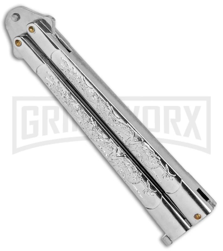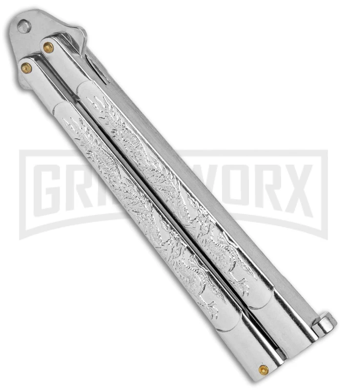 Take your flipping skills to the next level with the Silver Dragon butterfly knife from Super Knife. This model has silver handles and a stainless steel blade with a plain edge. Item includes a T-latch for secure use.