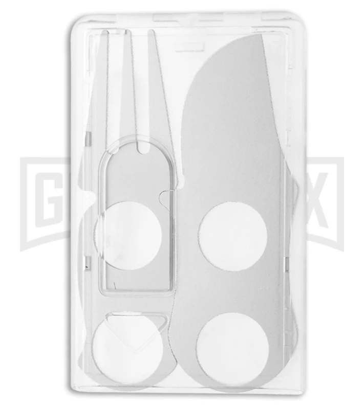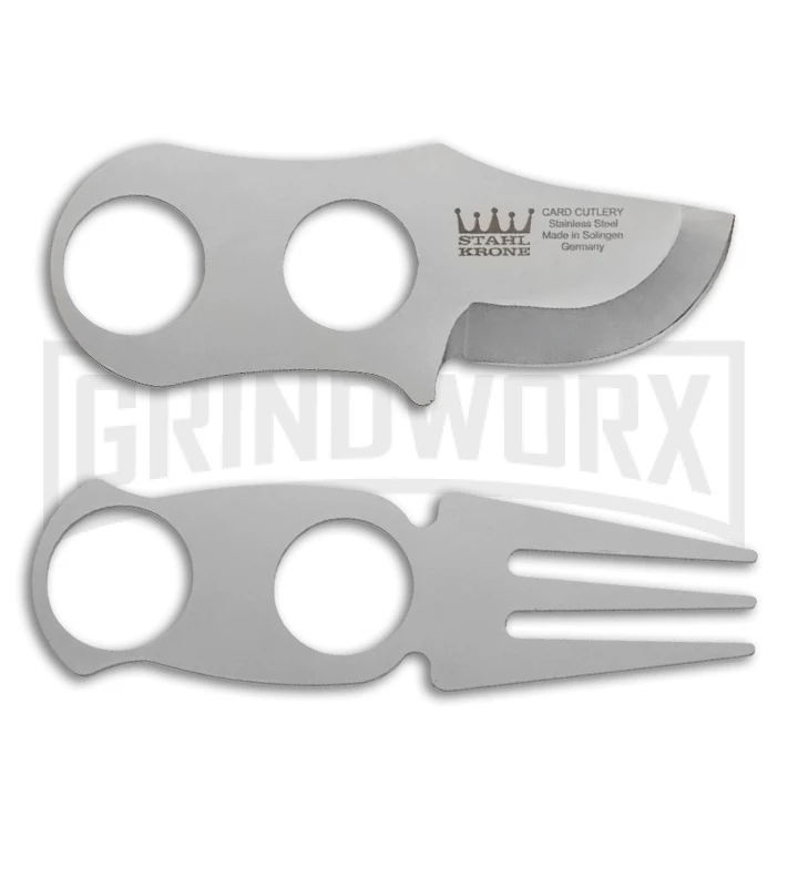 The Simba-Tec Card Cutlery Fork & Knife makes a great addition to any wallet! This Solingen-made credit card knife features stainless steel construction and comes in a clear plexiglass credit card size storage sleeve. Measures 3.50″ (L) x 2.50″ (H) x 0.16″ (W).