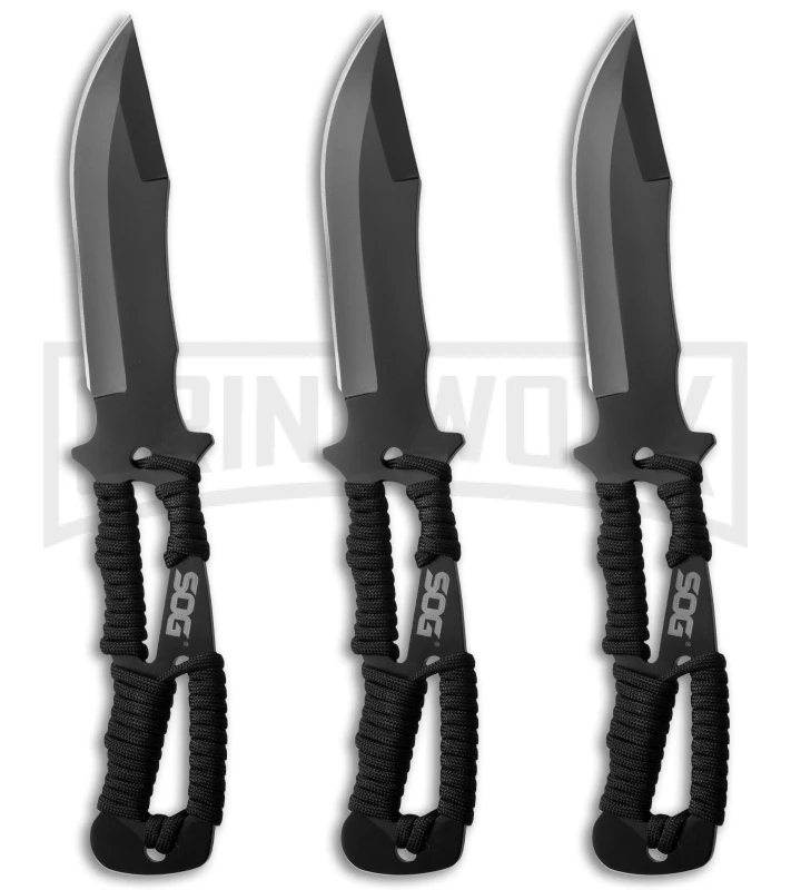 These stylized knives are not only fun to sail through the air, they are practical as well. Protected by SOG’s hardcased black coating, they are extremely scratch resistant. Their balance, aerodynamics, and proportions make them great throwing knives. For the same reasons, they also make great back-up field knives. Handles are wrapped with paracord or use without it and you have three knives for the price of one! Includes nylon sheath that safely carries all three.