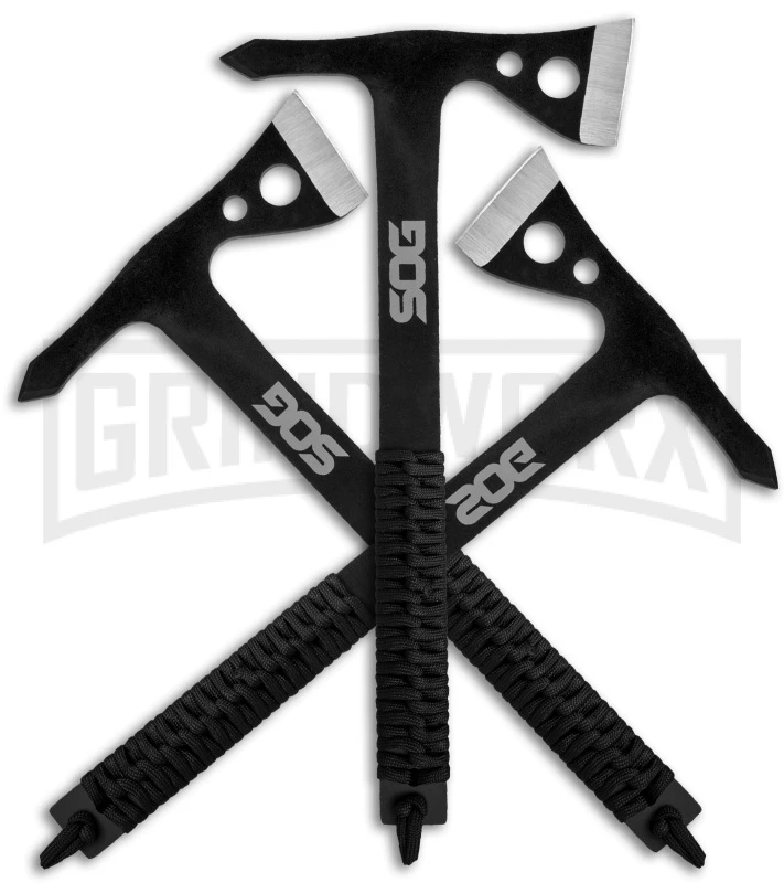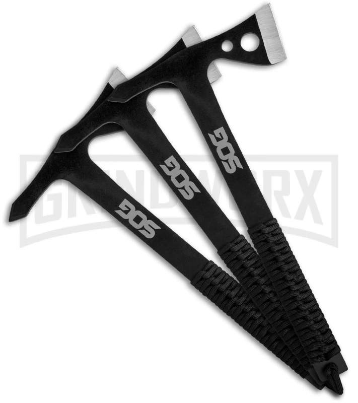 These stylized Throwing Hawks are not only fun to sail through the air, they are practical as well. Protected by SOG’s hardcased black coating, they are extremely scratch resistant. Their balance, aerodynamics, and proportions make them great throwing hawks. For the same reasons, they also make great back-up field tools. Handles are wrapped with paracord or use without it and you have three tomahawks for the price of one! Includes nylon sheath that safely carries all three.