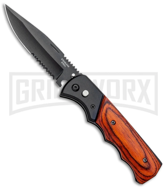 This Super Knife Dingo auto features a durable stainless steel handle with a rosewood front scale. Its black finished blade is made from stainless steel with a partially serrated cutting edge and aggressive jimping on the spine. A responsive firing button allows easy one-handed blade deployment. The knife comes equipped with a secure pocket clip and safety switch for safe everyday carry.