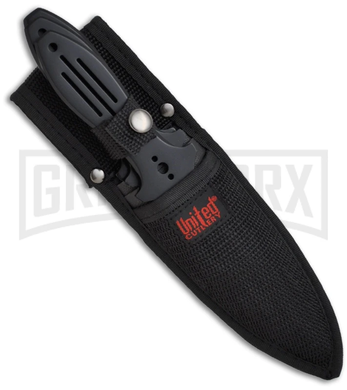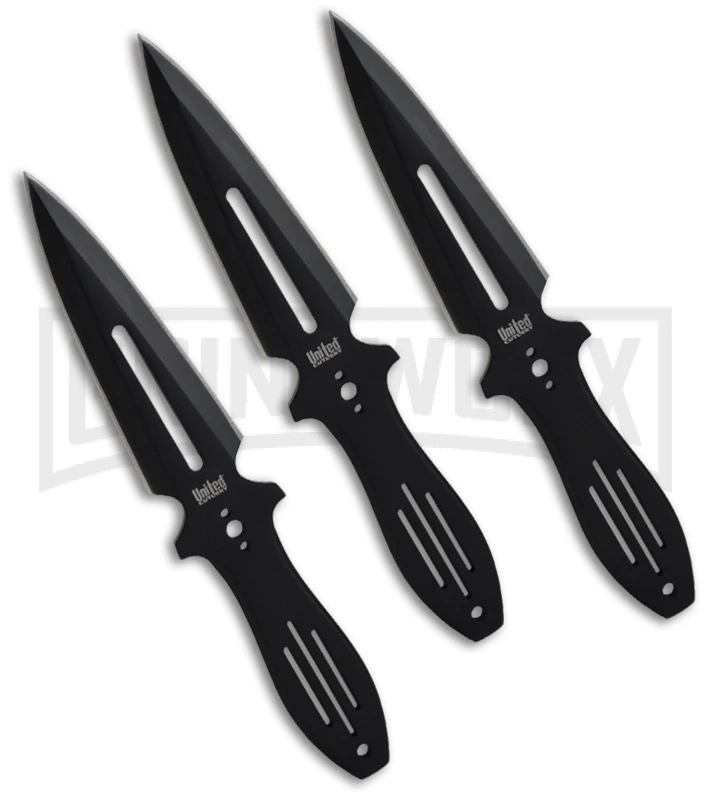 The United Cutlery Triple Threat throwing knives feature solid 420 stainless steel with a double edged dagger blade. The knives are black finished and come with a nylon sheath for carry and storage. Set of three knives.