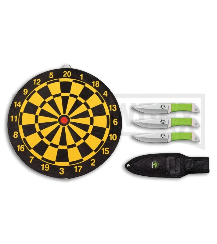 The Z-Hunter Hazardous is a three piece throwing knife set that comes with a target board 9″ in diameter. Perfect practice for a zombie attack! The well balanced stainless steel, skeletonized tang has a stain finish. The handle is wrapped with neon green cord. This also includes a black nylon belt sheath that holds all three.