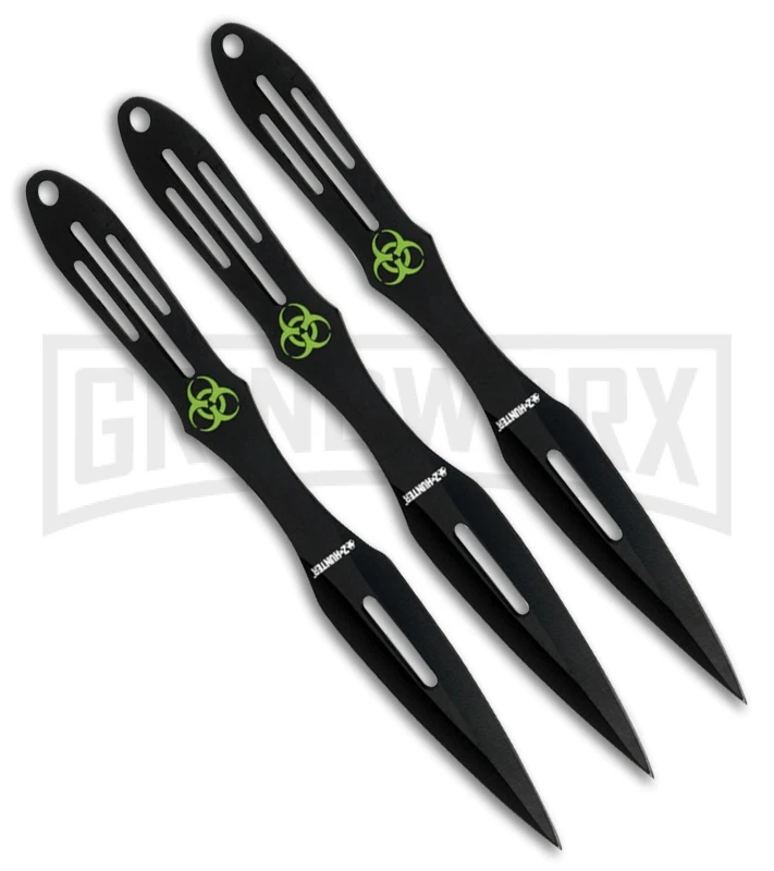 The Z-Hunter Zombie Thrower Set & Target is a 3 piece set fixed blade throwing knives for recreation and tactical use. Everyone likes the simple sport of throwing knives. No sound is more satisfying than a thrown knife as it “thunks” and sticks in a wooden target. If you are looking for a great set of knifes to hone you skills against the undead look no further! The skeleton tang, black finished stainless steel blades are double edged dagger styled. The contoured handles have slot cutouts and a green bio-hazard logo. Included is a black nylon belt sheath that holds all three knives. A 14.625″ overall target board with zombie and red splatter design. Hardware is also included and it is shipped clam shell packed.