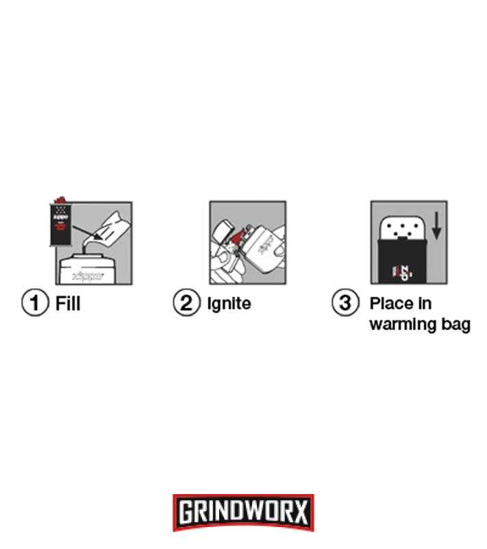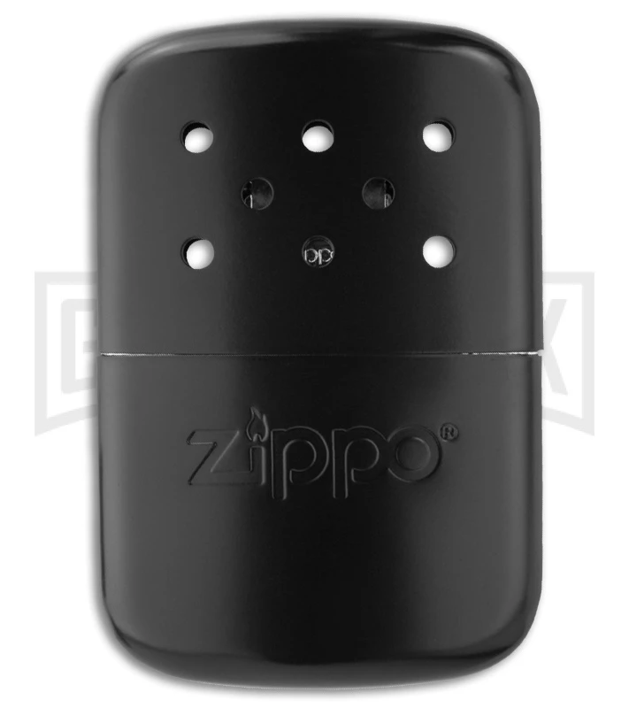 Zippo hand warmer with a black finished case. Includes warmer bag and filling cup. Fill with Zippo’s premium lighter fluid for up to 12 hours of warmth per use. Dry weight is 3 oz with bag. are sold separately. Made in the USA.