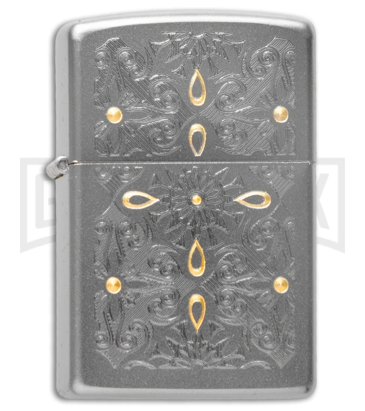 This Zippo lighter has a satin chrome finished body with a classical ornate etching.