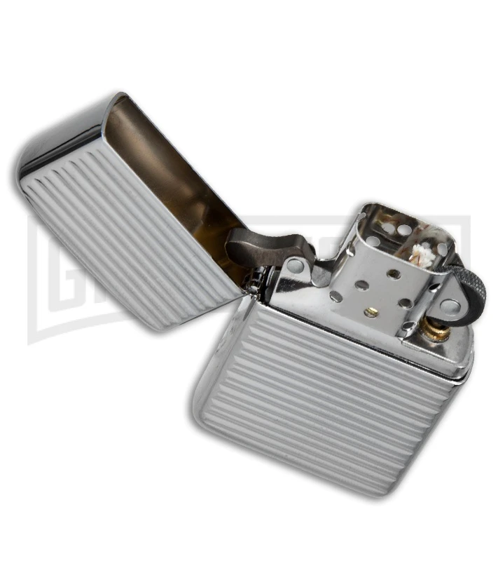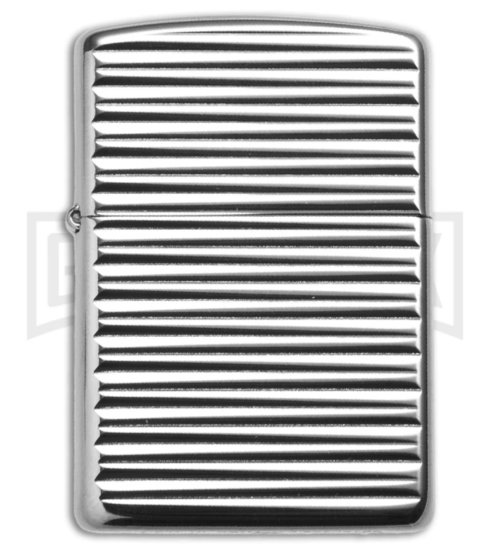 Simple yet chic. This high-polish chrome Armorย lighter features a horizontal striped pattern that gives this lighter a textured look. Comes packaged in an environmentally friendly gift box. For optimum performance, fill with Zippo premium lighter fluid.