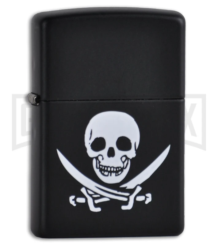 This Zippo lighter has the Jolly Roger Skull on a matte black body.