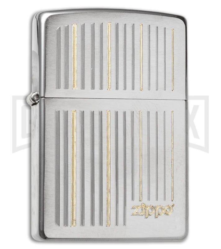 This Zippo lighter has vertical barcode style lines on a brushed chrome finished body.