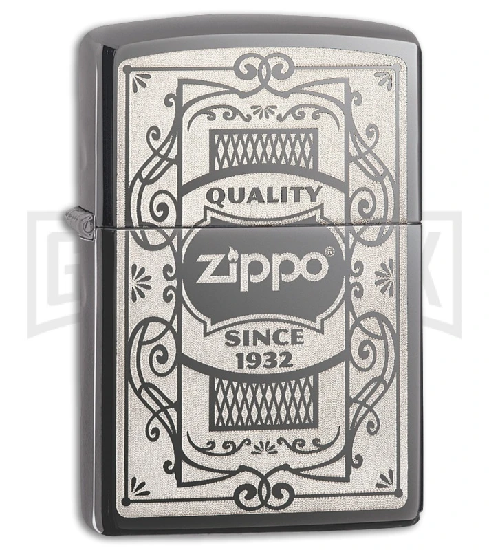 This intricate black and white design will remind you of the origin of Zippo. The vintage design of the Zippo logo has been engraved onto a Black Ice® lighter.